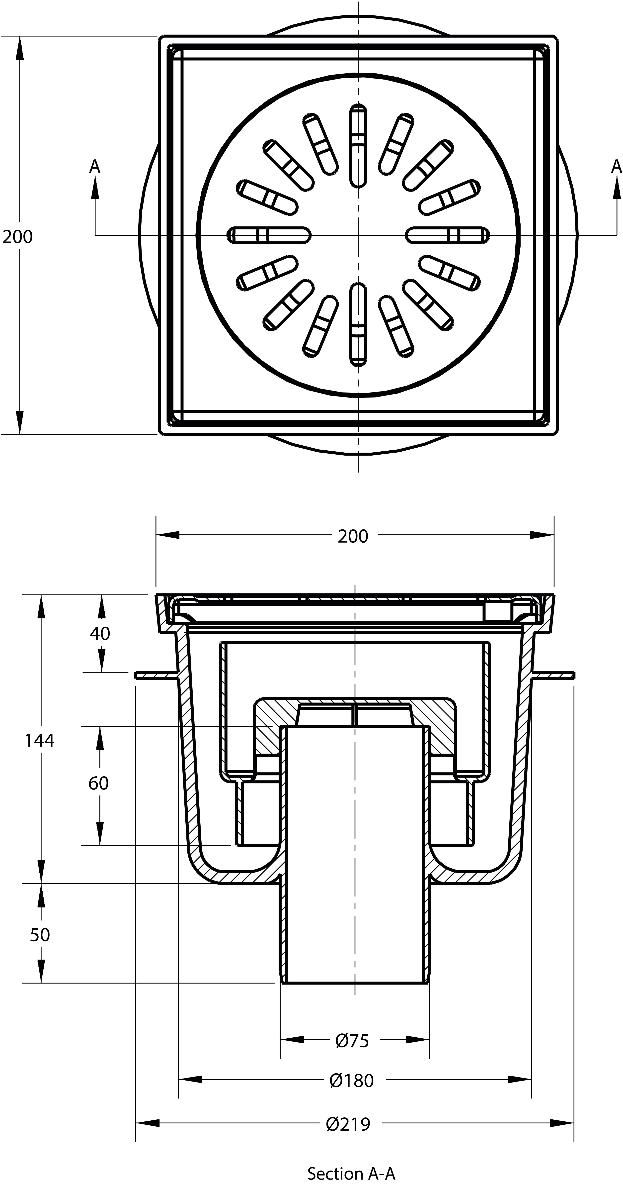 HomeBuitengevelAfvoer en leidingmateriaalPutten en dekselsABS Afvoerput 200x200mm Onderaansluiting RVS Rooster 4020 Met PPC Vuilvangemmer Niet Verstelbaar