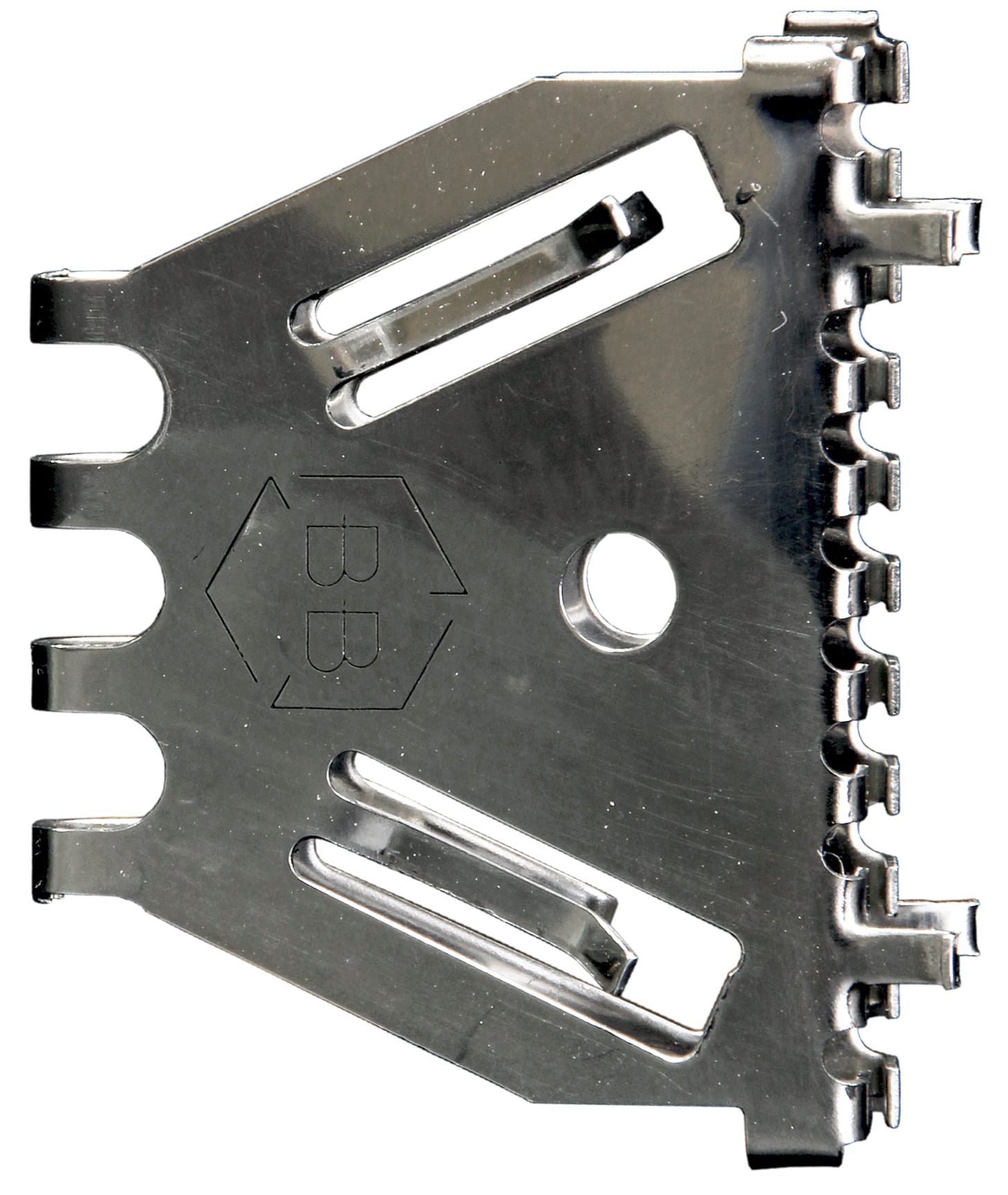 Uniek makkelijk plaatsbaar roestvrijstalen stootvoegrooster type "Bijenbekje" 50mm hoog (waalformaat). Past zich automatisch aan de breedte van de voeg, automatische borging en hulpnokjes voor makkelijk positioneren.