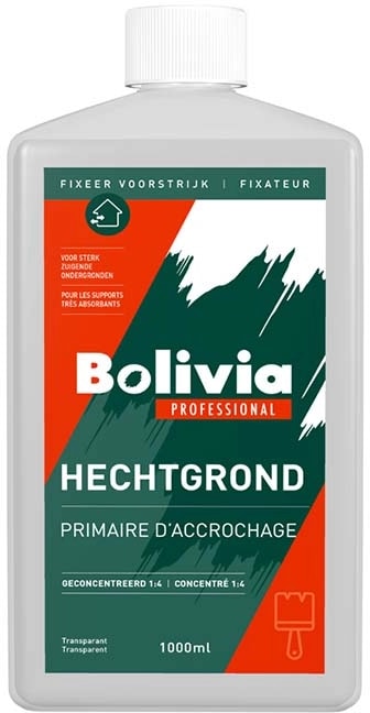 Bolivia Fixeer/Hechtgrond is een transparante geconcentreerde universele fixeer/hechtgrond en voorstrijkmiddel voor sterk zuigende ondergronden. Heeft een uitstekende hechting op minerale en cement- (achtige) ondergronden.