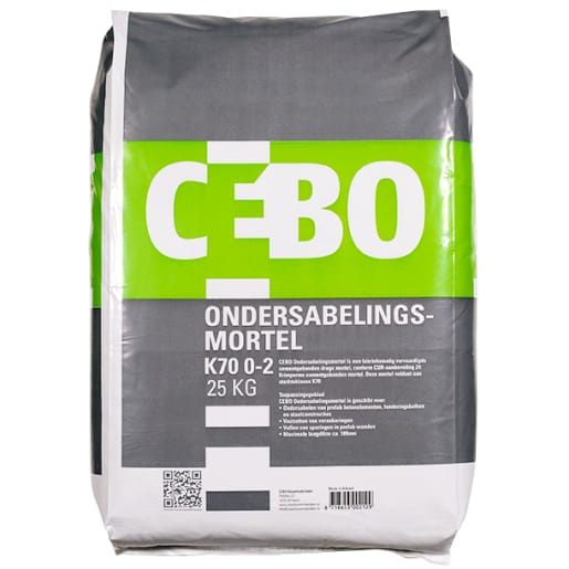 CEBO Ondersabelingsmortel is een fabrieksmatig vervaardigde cementgebonden droge mortel, conform CUR-aanbeveling 24: Krimparme cementgebonden mortel. Deze mortel voldoet aan sterkteklasse K70. Deze mortel is toe te passen in alle milieuklassen genoemd in de NEN-EN 206-1.