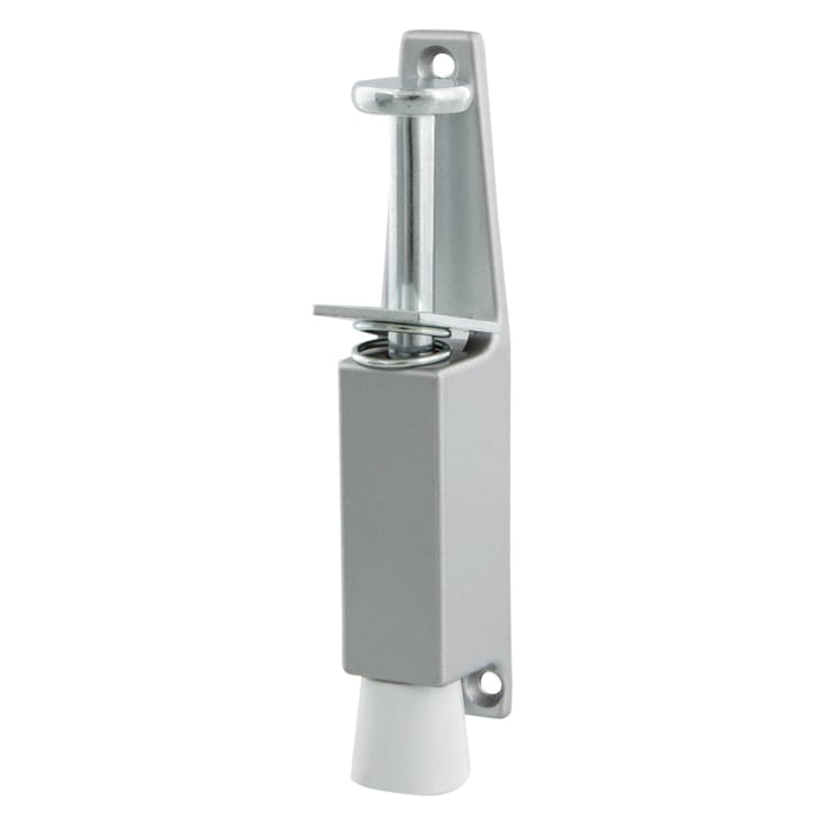Voor voetbediening. Metalen grijs gegoten kast en achterplaat. Staal verzinkte vastzetter en bedieningspal. Met zwarte voetknop, rubber stopvoet en krachtige veer.