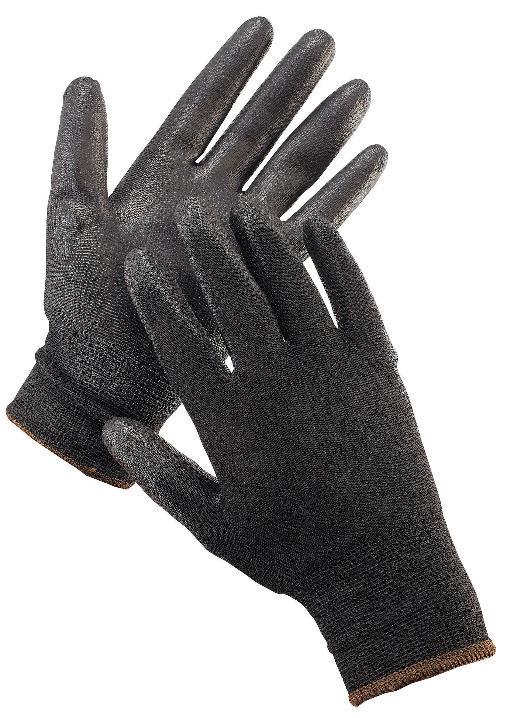 Naadloos rondgebreide polyester handschoenen met een gedipte PU palmcoating en manchet.