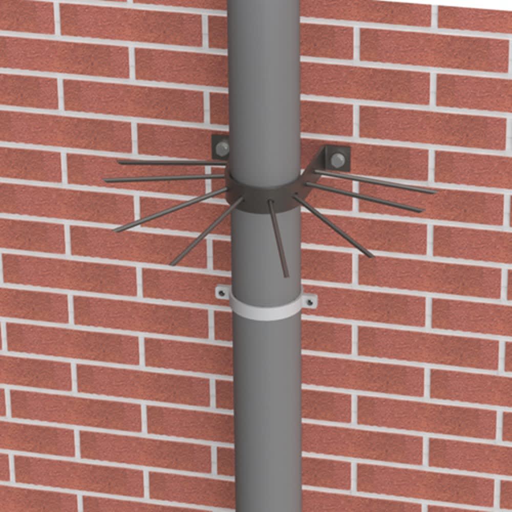 Anti klimbeugel met pennen (type vlak of versprongen) om aan de muur te bevestigen rond een regenpijp (inwendige breedte beugel 105 mm), ter voorkoming van het omhoog klimmen via de regenpijp.