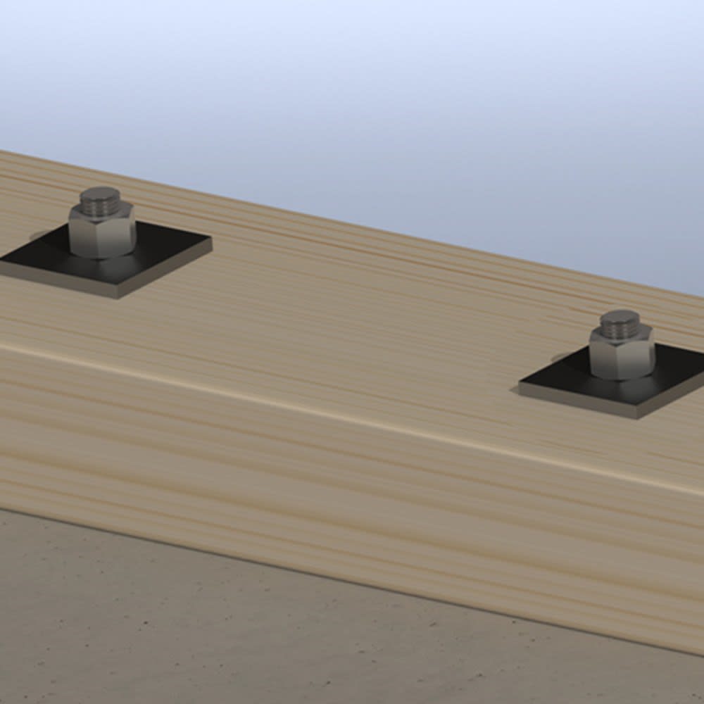 Vlakke vierkante volgplaat voor toepassing bij solide bout/moerverbindingen op houten baddingen en betonbekistingen. Leverbaar in verschillende maten en met diverse boorgatmaten.