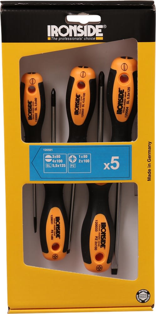 HomeHandgereedschapSchroevendraaiersSchroevendraaiersetsIronside Schroevendraaierset Pozidrive/Zaagsnede 5-delig