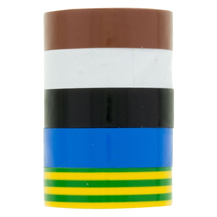 Isolatieband in diverse kleuren; zwart, wit, geel/groen, blauw en bruin.