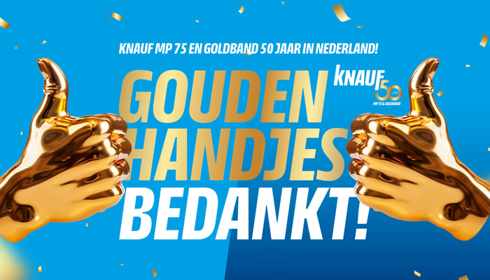 Onze Knauf MP75 en Knauf Goldband gipspleisters bestaan dit jaar 50 jaar in Nederland. Ter ere van dit gouden jubileum start Knauf in mei met de Gouden Handjes bedankt! campagne. Deze campagne staat in het teken van het eren en bedanken van alle stukadoors die dagelijks met onze gipspleisters werken.