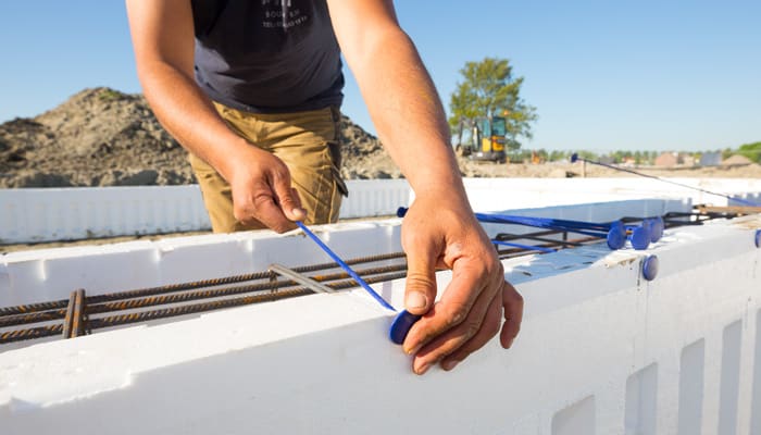 In plaats van de traditionele stalen beugels en houten regels worden aan de bovenzijde van de kistwanden speciale trekpennen geplaatst. Deze zorgen ervoor dat de kist sterk en maatvast is tijdens het storten van het beton. Bijzonder is dat deze trekpennen na de stort niet hoeven te worden verwijderd! Ze worden namelijk in sleufjes bovenin de EPS-bekisting geduwd, waardoor ze niet aan de oppervlakte, maar wat dieper liggen. Hierdoor kan het beton na het storten snel, strak en eenvoudig worden gladgestreken. Ook na uitharding hoef je de kunststof trekpennen niet te verwijderen. Je kunt direct met het leggen van de vloer beginnen. Dat betekent nog meer tijdwinst!