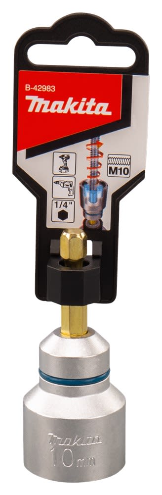 Makita draadeinddop, de ideale dop voor het snel en efficiënt machinaal in- en uitdraaien van draadeinden, zonder de schroefdraad te beschadigen. Makita doppen hol/extra diep zijn het perfecte hulpstuk om machinaal moeren op en af draadeinden te draaien. Makita draadeinddop M10, de ideale dop voor het snel en efficiënt machinaal in- en uitdraaien van draadeinden, zonder de schroefdraad te beschadigen. Deze dop heeft een 1/4" ZK vorm E aansluiting. Niet geschikt voor gebruik in combinatie met slagschroevendraaier.