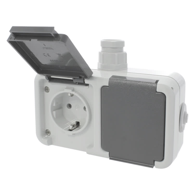 Peha contactdoos opbouw, 2-voudig, randaarde grijs. Snel en makkelijk aansluiten door voorgemonteerde wartel.
