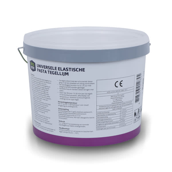 ProOne universele elastische pasta tegellijm is geschikt voor binnensituaties bij het verlijmen van wandtegels, grestegels (op vochtabsorberende ondergrond), donkergekleurd natuursteen en mozaïek op nagenoeg alle cement- en gipsgebonden ondergronden. Tevens is de lijm geschikt voor tegel over tegel situaties en diverse plaatmaterialen.