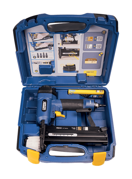 Kracht, precisie en veelzijdigheid, de PBS151 is een professionele duale pneumatische tacker voor smalrugnieten en brads. Ideaal voor snel werken met meubels, lambrisering, schrijnwerk en afwerking. Met 360° verstelbare luchtuitlaat die stof weghoudt van het werkoppervlak. Andere kenmerken zijn onder meer een snel laadsysteem en comfortabele greep welke vermoeidheid reduceert. Voor gebruik met smalrugnieten tot 40mm en brads tot 50mm. Geleverd in een handige beschermende opberg- en transportkoffer met daarin een snelstartgids die helpt de tacker correct te gebruiken en de juiste nieten/nagels te vinden wanneer deze bijgevuld moeten worden. Inclusief starterset van 200 25mm nieten en 200 50mm nagels.