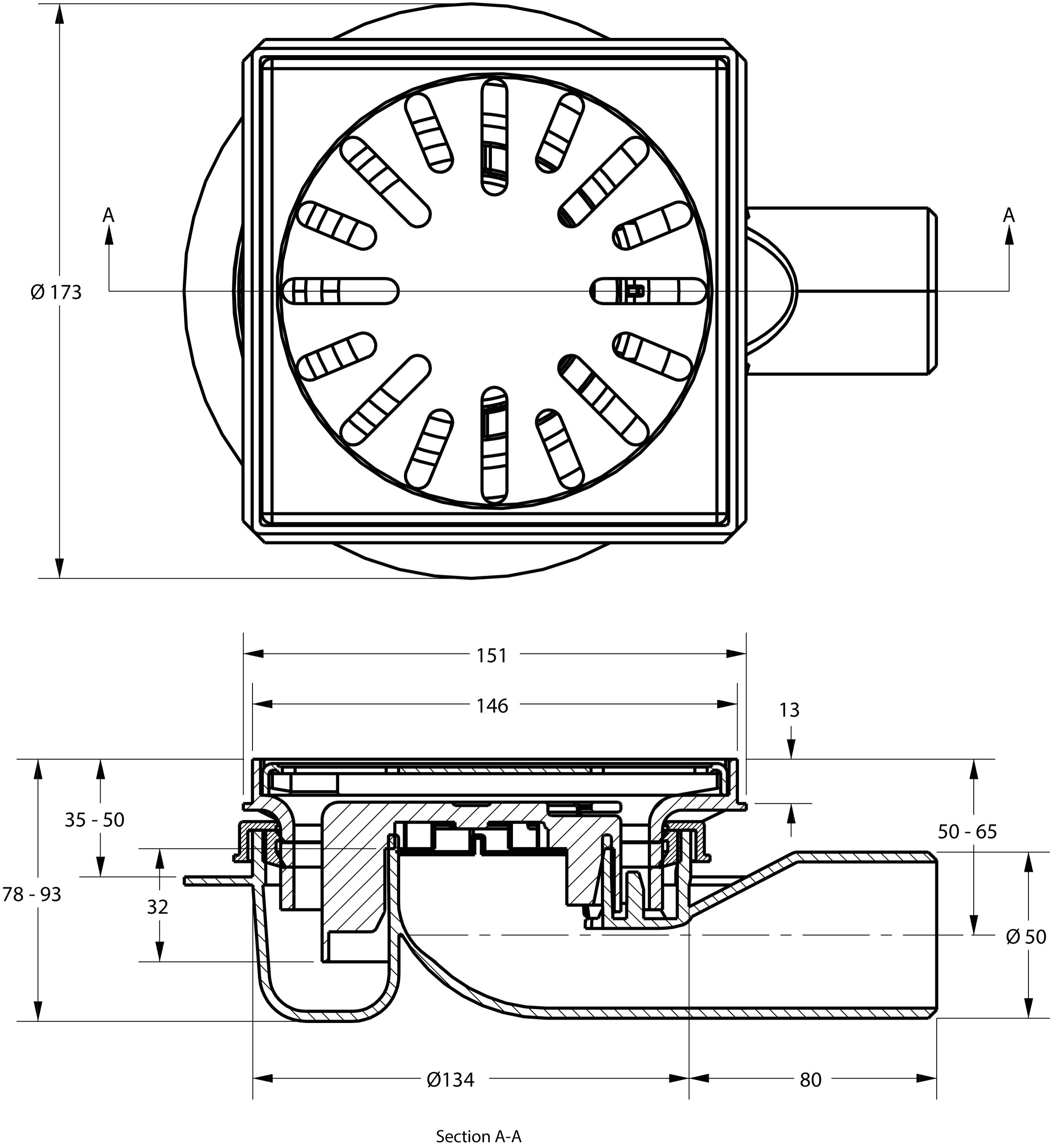 Vloerput ABS 4016146 Zijuitlaat 50mm 146X146mm Laag Model
