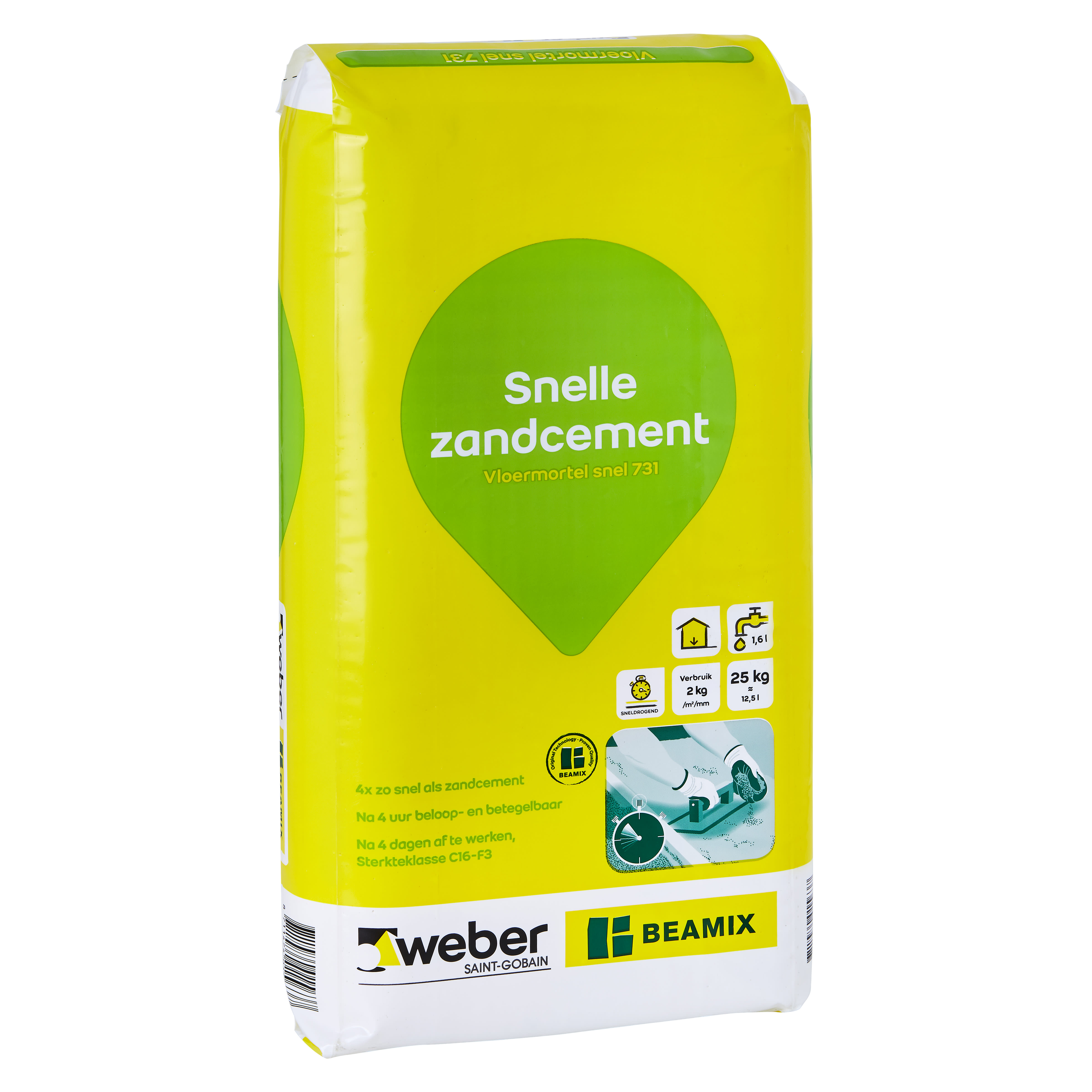 Weber Beamix Vloermortel snel 731 is een kant-en-klare, sneldrogende zandcementmortel, op basis van NEN-EN 13813. Sterkteklasse: C16-F3. De mortel is 4x zo snel als zandcement. Na 4 uur beloop- en betegelbaar en na 4 dagen af te werken.